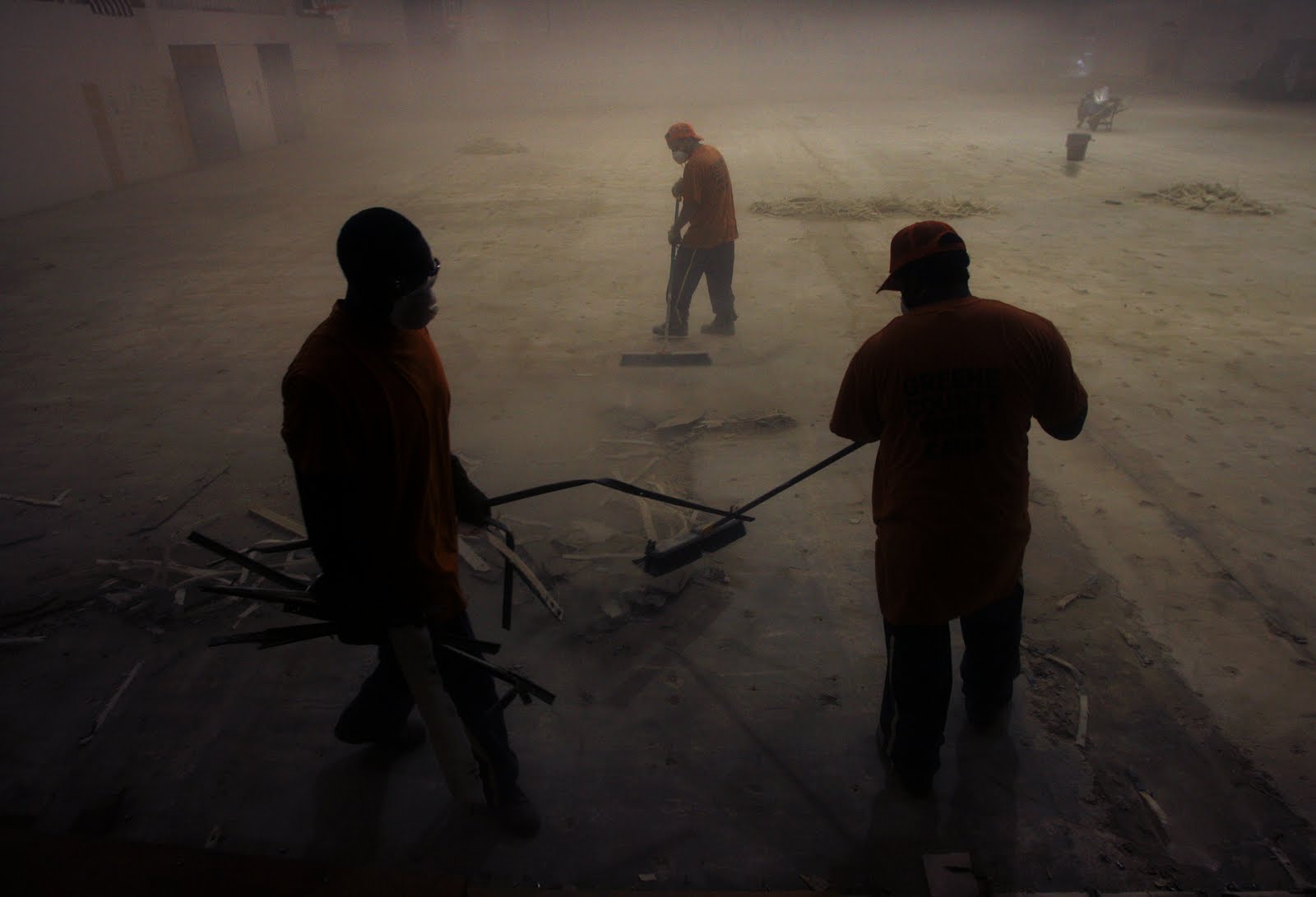 Inmates from the Greene County Work Camp are surrounded by dust as they remove the last pieces of flooring in the Education Complex gym at MacMurray College in Jacksonville. The gym will be updated this year after sustaining significant flood damage June 18. July 29, 2011